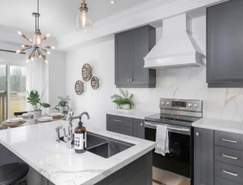 - Quartz or laminate countertops in kitchens and baths (per plan)